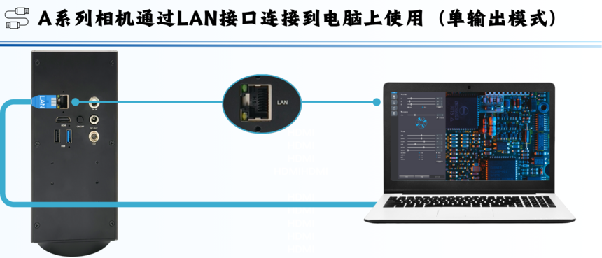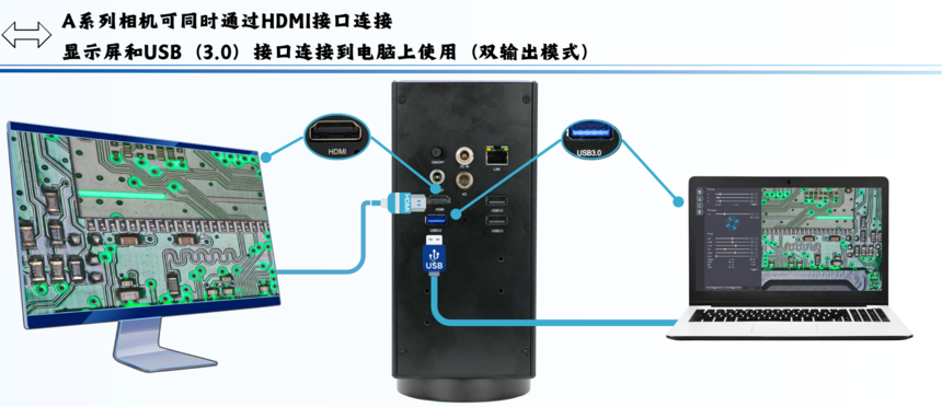 相机连接方式 A324相机搭载市面上大部分主流输出接口,如HDMI、USB 3.0及LAN,并支持三输出模式,确保数据传输如行云流水,让效率与便捷同行。
