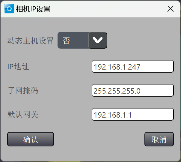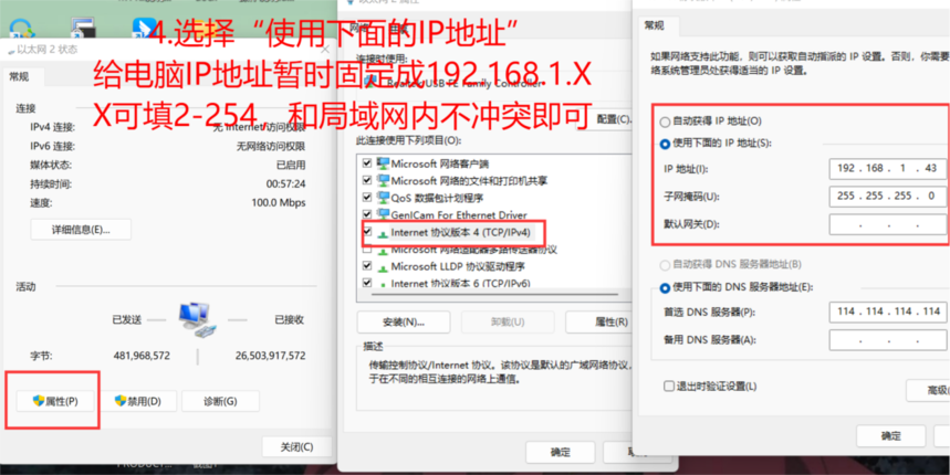 电脑软件如何连接网络相机方法一:电脑网口直连相机网口 1. 用网线分别连接相机和电脑的网口; 2. 部分相机支持连接显示器和鼠标进行操作,我们就可以先连接显示器调出菜单的IP设置界面,直接将相机的IP地址修改成所需要的;如果相机的IP无法直接修改,那么首次连接上相机,需要先固定电脑的IP地址,使得电脑和相机的IP在同一个网段。当子网掩码为255.255.255.0时,IP地址的前三位是一致的,就是同一网段。(其他子网掩码,ip是否在同一个网段建议联系网络技术人员确定) 例: 电脑IP:192.168.0.43 ,相机IP:192.168.1.247 则表示不在同一网段; 电脑IP:192.168.1.43 ,相机IP:192.168.1.247则表示在同一网段。 我司相机出厂IP为:192.168.1.247/192.168.3.247/192.168.1.182。 电脑IP地址设置方法(建议您也可以百度查询,不同系统win7、win8、win10、win11下设置界面可能存在差异): Win7系统: